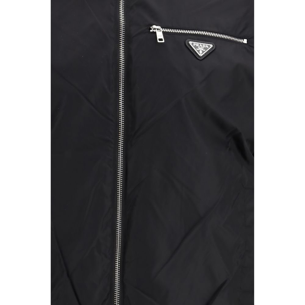 The Reversible Wool and Re-Nylon Jacket a versatile and modern design defines this reversible jacket crafted from virgin wool and Re-Nylon, featuring a slim fit, a stand collar, and the signature metal triangle logo on the chest. It is finished with a central zip fastening and ribbed cuffs and hem for a clean, functional silhouette. The Re-Nylon side includes an exposed zipped chest pocket, while the wool side offers a softer and more refined look. To preserve the garment and reduce microfiber shedding, avoid frequent washing, air it after each wear, and rely on eco-friendly professional dry cleaning.