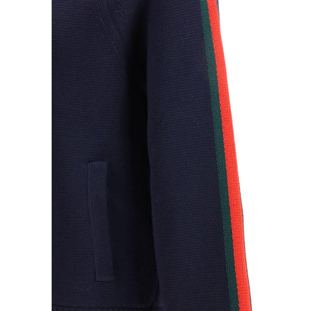 The zip-up Jacket by Gucci is crafted from knitted wool with a textured stitch and features a GG shearling interior for added warmth and refinement. The design is finished with iconic Web trims, a stand collar, and practical front pockets. A front zip closure completes the piece, combining comfort with a distinctive, luxurious aesthetic.