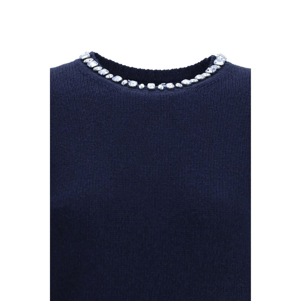 The wool and cashmere crew-neck Sweater by Prada is a sophisticated piece that combines softness and structure, thanks to the fine wool and cashmere blend. The shaved knit gives a compact and refined texture, while the masculine fit adds a touch of timeless elegance. The ribbed collar, embellished with crystals on the crew neck, offers a bright and distinctive detail, while the English shoulders and ribbed cuffs complete the design with an impeccable fit. Prada’s discreet yet recognizable triangle logo signs the garment with its iconic style.