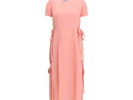 The crêpe marocain Dress by Prada channels an intimate, inherent elegance through its generous silhouette and fluid construction. The shirt collar, asymmetrically designed and illuminated with intricate embroidery adds a refined retro touch, further enriched by delicate decorative bows. A back button closure, short sleeves, and a flared hem enhance the dress’s soft, effortless attitude, while the semi-lined structure ensures a graceful drape. A piece crafted to express a subtle yet unmistakably sophisticated femininity.