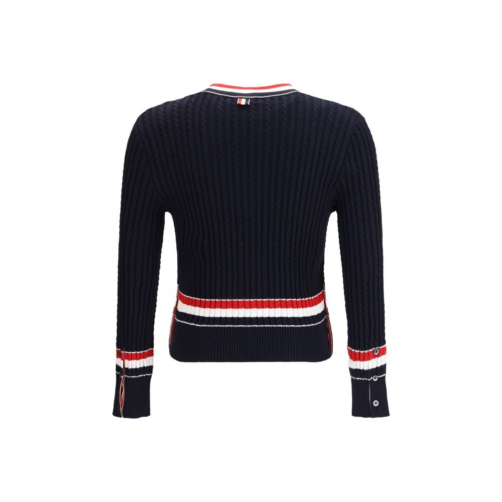 The intarsia cable-knit V-neck Sweater by Thom Browne reimagines the classic cricket pullover with a distinctive contemporary elegance. Featuring a refined cable-knit construction, it is designed with a V-neckline that enhances the silhouette. Button details add a subtle graphic accent, while ribbed cotton cuffs and hem provide a balanced and polished fit.