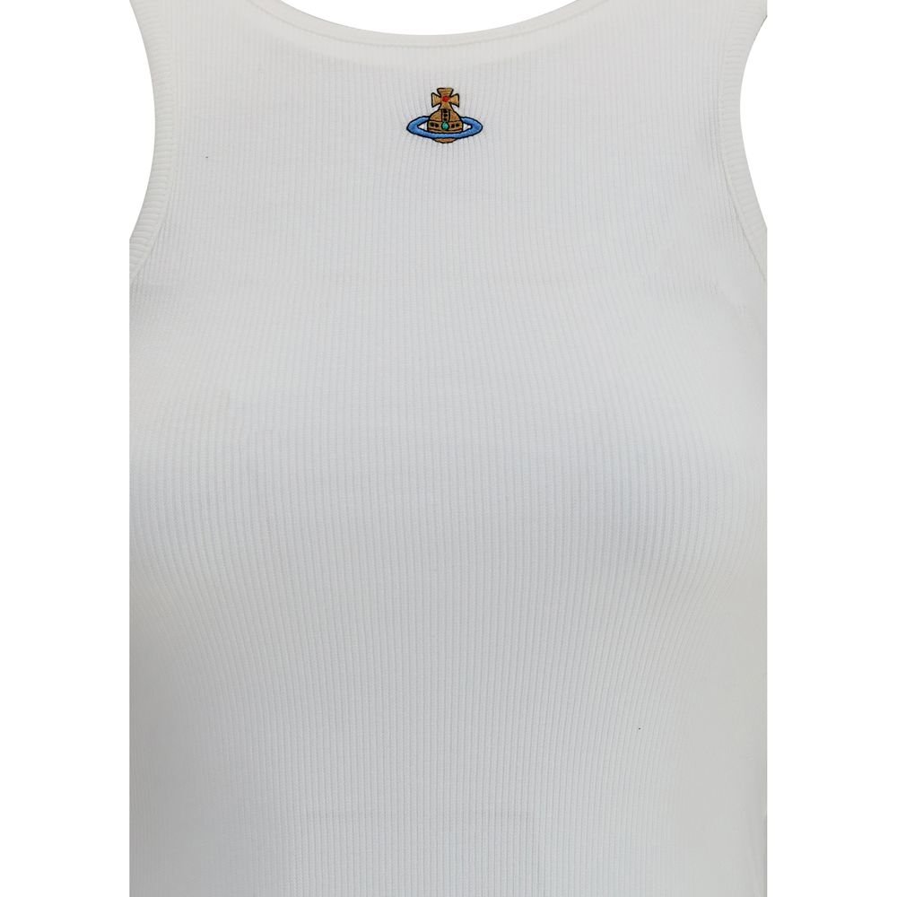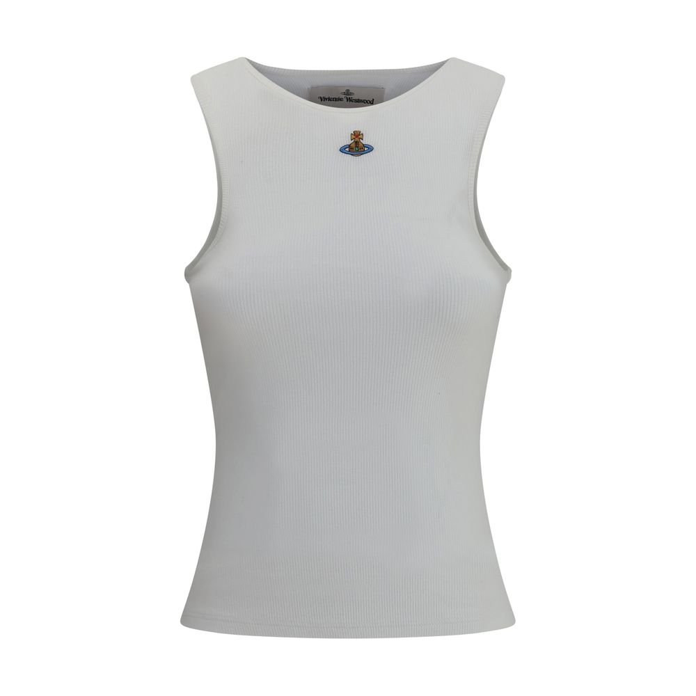 The Tank Top with log by Vivienne Westwood features a round neckline and a ribbed design that enhances the fit. An embroidered logo patch stands out on the front, an iconic detail that gives the garment a distinctive, contemporary touch.