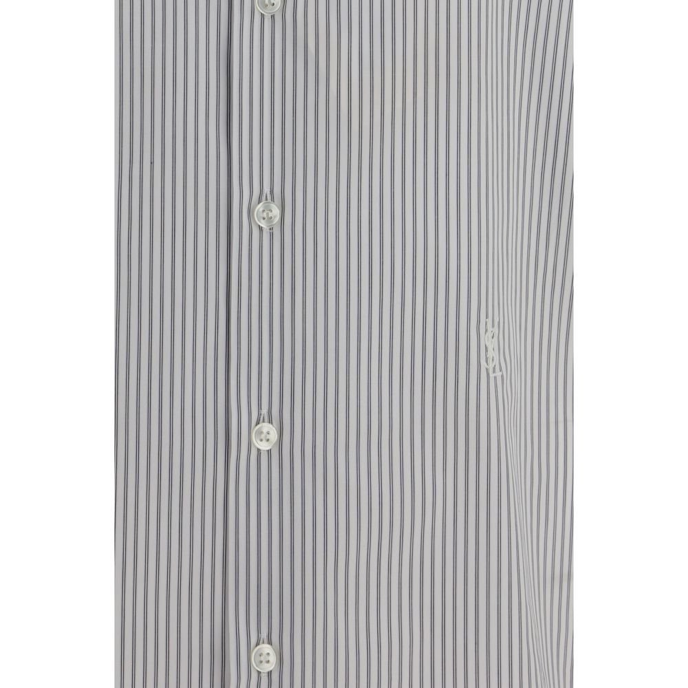 Cămașa în dungi cu închidere prin butoni și guler clasic de la Saint Laurent exprimă o eleganță subtilă printr-un model atemporal.
