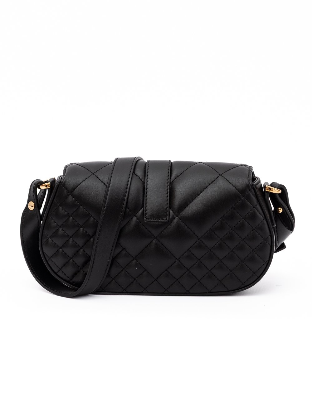 Geantă de umăr Versace, din piele de miel, neagră, cu curea ajustabilă și logo gravat pentru un look elegant.