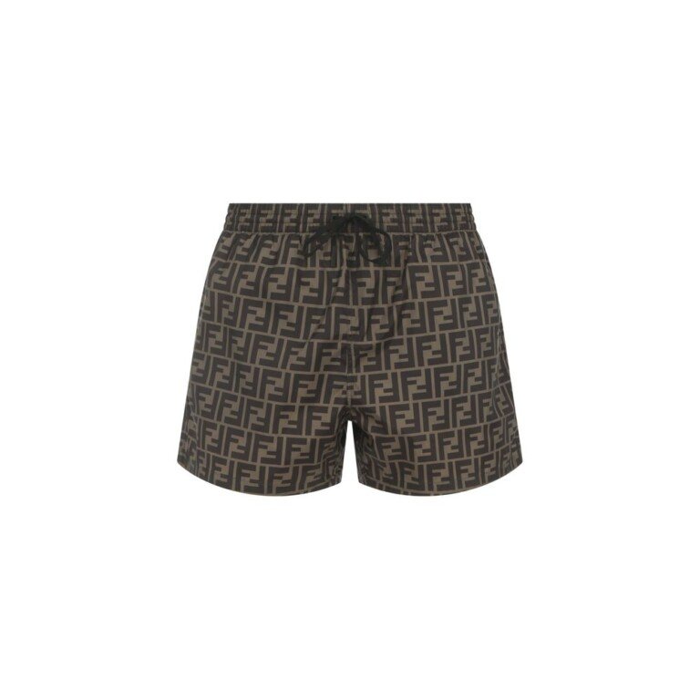 Swimwear by Fendi, elasticized waistband with adjustable drawstrings, two side welt pockets, iconic all-over contrasting repeated brand monogram. Season: SS26
