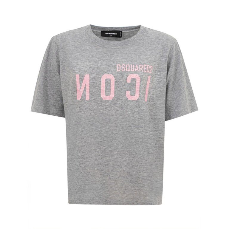 Grey Mélange T-Shirt with Dsquared2 Icon logo. In grey cotton, crew neck, short sleeves, regular fit. Contrasting pink logo print