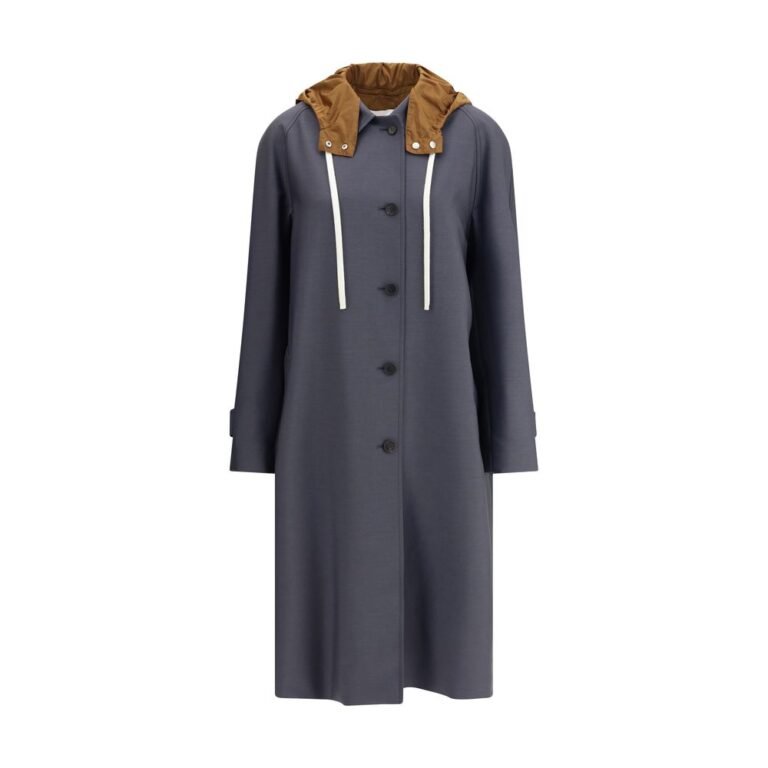 Miu Miu’s hooded long Coat blends a tailored silhouette with contrasting elements, such as the sleeves and detachable hood made
